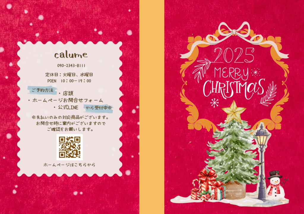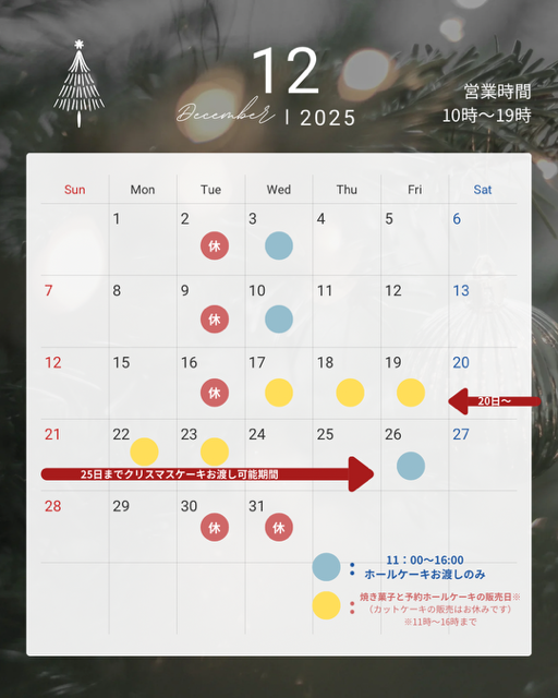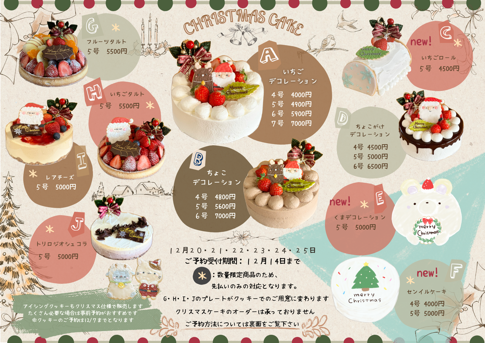 2025Christmas Cake Menu クリスマスケーキご予約受付中!受付期間:12月14日まで12月20日~25日までクリスマスケーキのお渡しが可能です。ご予約はご来店・お問合せフォーム・公式LINEにて受付が可能です。※C・E・F・G・H・I・Jは数量限定商品のためご来店にて先払いのみの対応となります。ケーキの中身や飾りについて*A・D・E・Fはすべて紅ほっぺいちごが2段サンドされたいちごショートケーキになっています*Bも紅ほっぺいちごが2段サンドされたチョコショートケーキです*Cは自家製いちごジャムを生クリームにたっぷり混ぜたイチゴクリームを巻いたロールケーキをノエル風にデコレーションしました*Gのフルーツタルトはいちご、みかん、オレンジ、りんご、ぶどう、ブルーベリーが乗ります*飾りのプレートはすべてアイシングクッキーに変わります。ご了承ください。 お渡し可能なお時間が限られている日もありますので、お間違いのないようご確認ください12月20日~29日までのオーダーケーキのご予約期間は12月5日までとなります※クリスマスケーキのオーダーは承っていません。